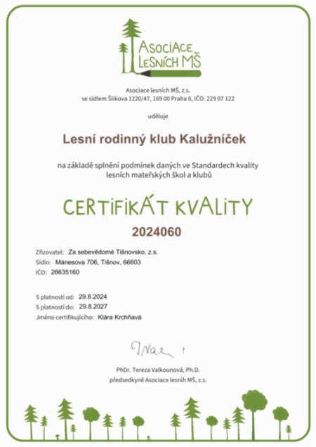 Lesní rodinný klub Kalužníček je spoluzakladatelem Asociace lesních mateřských školek, je jejím členem a také držitelem certifikátu kvality uděleným touto Asociací.