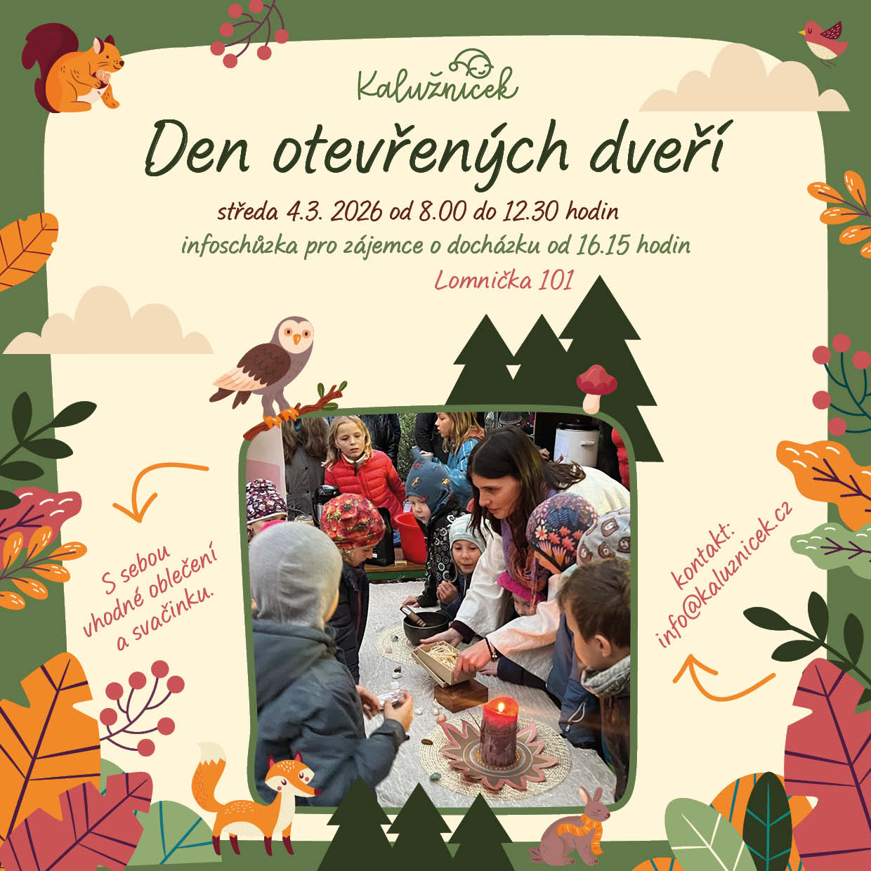 Přemýšlíte o zapsání vašeho dítka do Kalužníčku? Přijďte se k nám podívat. Můžete s námi strávit celé dopoledne a odpoledne se zúčastnit info schůzky nebo přijít aspoň na jednu část dne, kdy je Vám naše branka otevřena dokořán.